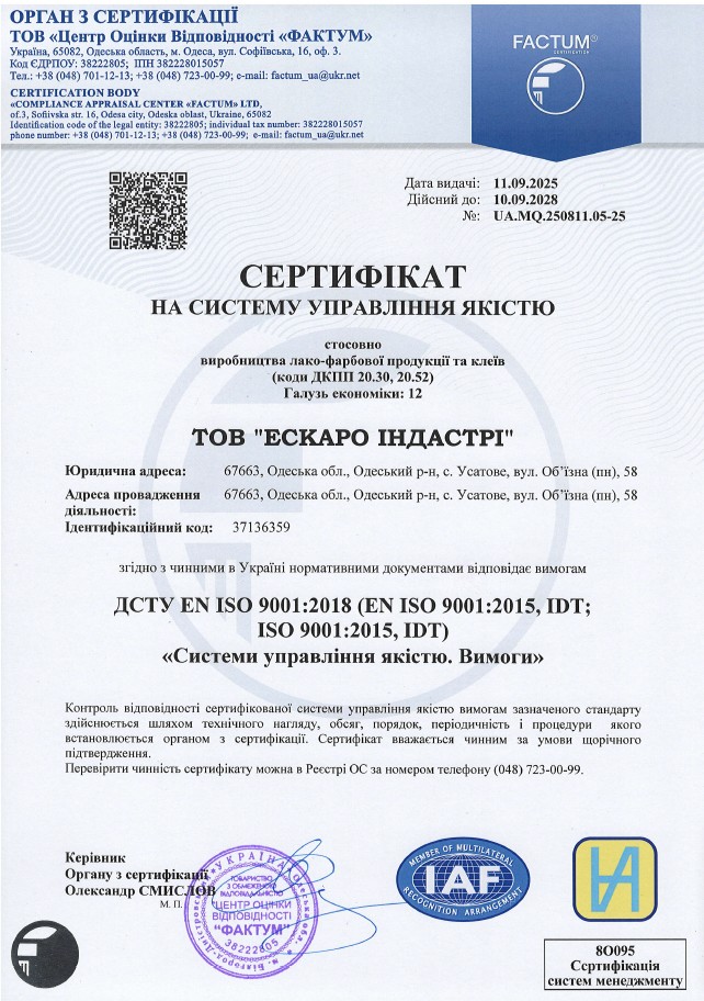 We are pleased to announce that Escaro Color has successfully renewed its ISO 9001 certificate (“Quality Management System. Requirements”). This confirms our ongoing commitment to excellence and high standards in manufacturing, service delivery, and process management.
