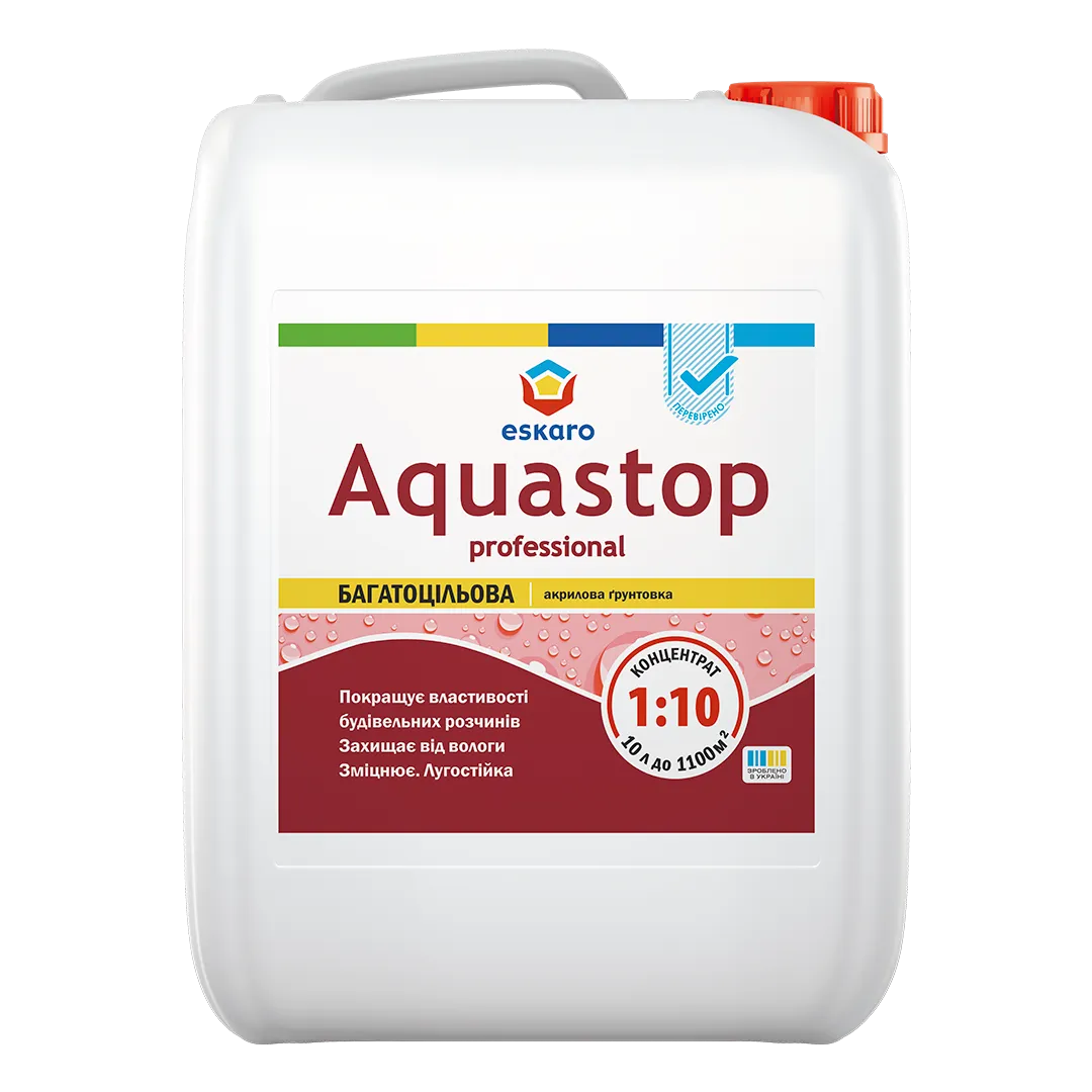 2. Модифікування (тобто покращення) властивостей цементних, вапняних, гіпсових будівельних розчинів (сухих сумішей) через додавання Aquastop Professional у воду, яка використовується для приготування розчину (на об’єкті).