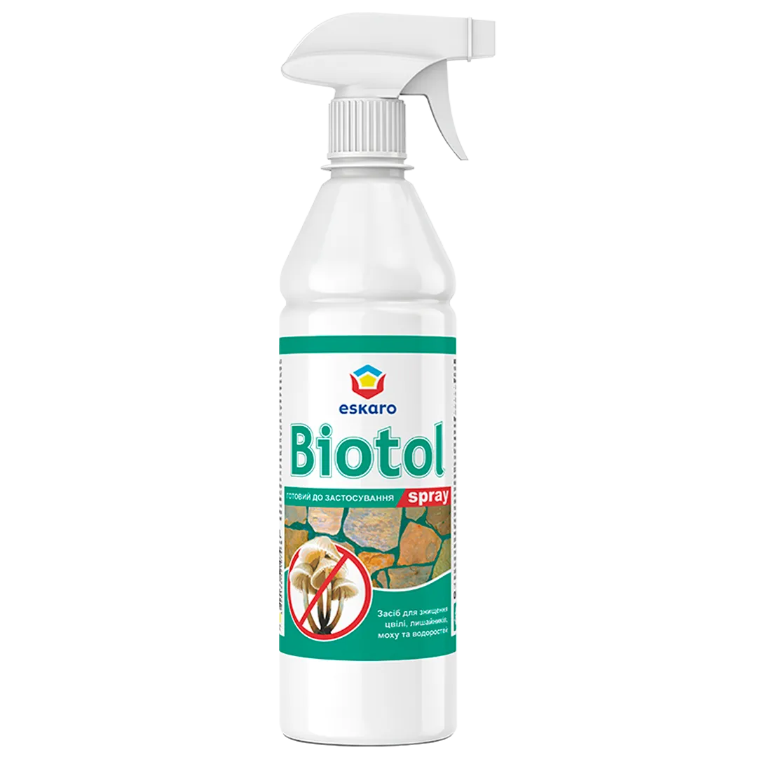 Готовий до використання. Перед використанням перемішати. Засіб рясно розпорошувати (або нанести пензлем або губкою) на поверхню, уражену мікроорганізмами за температури вище +5ºС. Під час нанесення слід уникати потрапляння засобу на розташовані поруч предмети. Якщо поблизу знаходяться рослини, квіти, городні культури, трава та кущі, їх слід закрити поліетиленовою плівкою. Через 1-2 дня (при зміні кольору розростань мікрофлори) поверхню ретельно очистити шкребком, твердою щіткою або губкою. Для профілактики повторного виникнення біологічних забруднень поверхню після механічного очищення обробити засобом Biotol Spray ще раз.Робочі інструменти