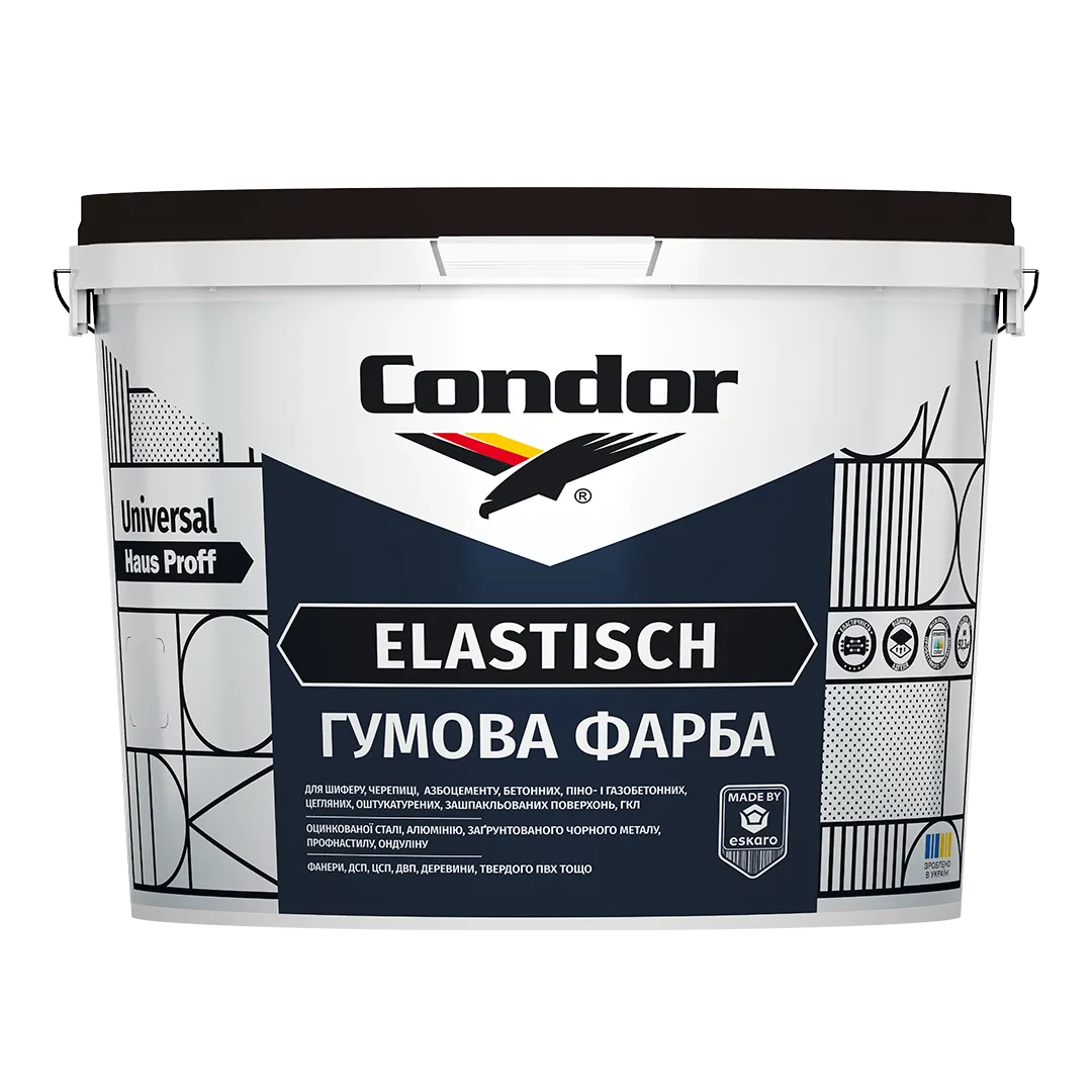 Стандарти: ✔️ Блиск (ДСТУ ISO 2813): не вище 10 GU при 85° (матова, G3, ДСТУ EN 1062-1). ✔️ Товщина сухої плівки: 100–200 мкм для одношарового покриття (E3, ДСТУ EN 1062-1). ✔️ Розмір частинок: не більше 30 мкм (дрібнозерниста, S1, ДСТУ EN 1062-1). ✔️ Паропроникність (ДСТУ EN 1062-1): висока, V1. ✔️ Водопроникність (ДСТУ EN 1062-3): середня, W2. ✔️ Маркування за ДСТУ EN 1062-1: G3|E3|S1|V1|W2|A0|C0. ✔️ Стійкість до миття: стійка до миття (1-й клас за ДСТУ EN 13300). ✔️ Стійкість до впливу атмосфери та сонячної радіації: покриття зберігає захисні та декоративні властивості в умовах помірно-континентального клімату не менше 7 років. Система покриттів являє собою: 1-й шар – ґрунтовка антикорозійна та два шари — фарба гумова універсальна TM Condor Hausproff Elastisch. Загальна товщина сухої плівки не менше ніж 160 мкм. Випробування проводилися на підготовлених сталевих пластинах, в атмосферних умовах згідно із ДСТУ ISO 2810 та в лабораторних умовах, під дією штучних джерел сонячного випромінювання (везерометра), згідно із ДСТУ ISO 16474-2. Термін служби покриття залежить від підготовки поверхні, умов нанесення матеріалу та умов експлуатації готового покриття. |