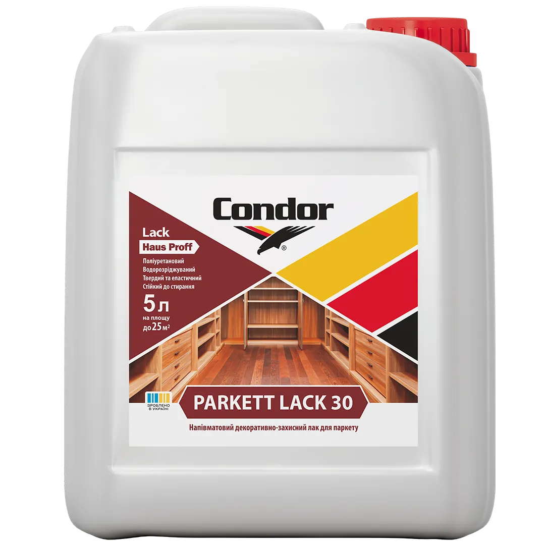 Properties Semi-matte water-based polyurethane parquet varnish. - Emphasizes the structure of the wood. - Excellently protects the surface from damage, dirt (domestic pollutants) and moisture penetration. - Withstands intense mechanical stress from abrasion. - Resistant to most household chemicals. - Forms a strong and elastic transparent colorless film. - Does not change the color of the wood. - Does not turn yellow. - Has no unpleasant odor. - Spreads well on the surface, dries quickly. - Has good adhesion to different types of wood. - The VOC content (volatile organic compounds) complies with European Union Directive 2004/42/EC. - Withstands repeated wet cleaning using neutral, non-abrasive detergents. - Do not use hard brushes and sponges, as well as organic solvents for cleaning. - When installing furniture, use special pads for the legs. Maximum permissible VOC content for the product (subgroup e) 130 g/L (2010). Max. VOC content in the product < 100 g/L. Hardness: - 100 (Koenig method, 7 days, DSTU ISO 1522:2015) Abrasion resistance: - < 15 mg (Taber Abraser/ cs-10/ 1000 cycles/ 1000 grams) Wet abrasion resistance: - Class 1 (DSTU EN 13300:2024). Purpose Decorative and protective polyurethane semi-matt water-based varnish for parquet. For new or previously painted surfaces. For interior work in residential and public premises with normal and high humidity. For "moving" floors and heated floors. The varnish is not intended for baths (saunas). Types of surfaces for application For wooden parquet: firmly glued mosaic, artificial, end, sheet (laminated). For wooden floors, wooden stair treads and railings. The varnish can be used for all wooden interior elements (tabletops, furniture, windows, doors, etc.), as well as wood materials (fiberboard, chipboard, MDF, OSB, cork, etc.).