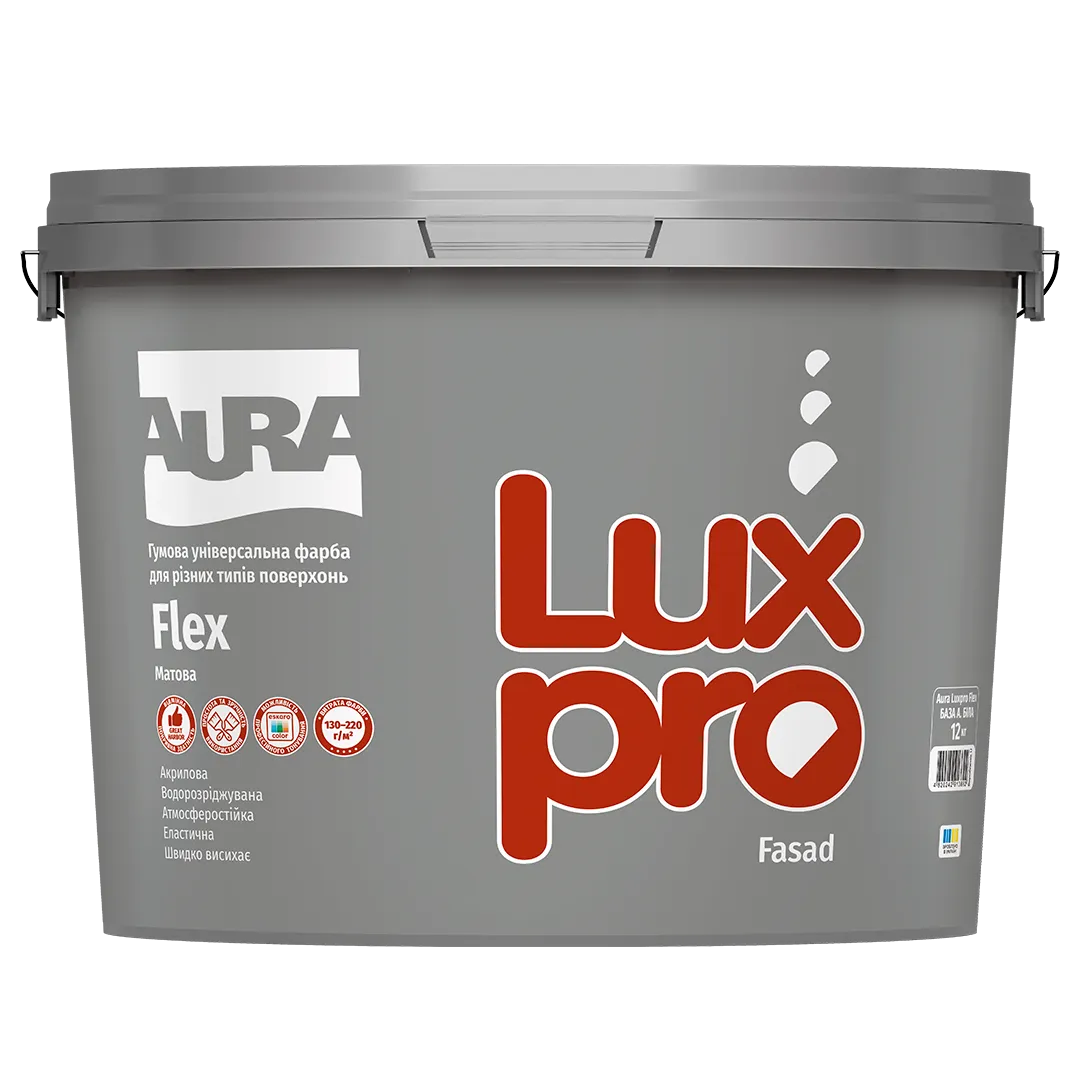 | Стандарти: ✔️ Блиск (ДСТУ ISO 2813): не вище 10 GU при 85° (матова, G3, ДСТУ EN 1062-1). ✔️ Товщина сухої плівки: 100–200 мкм для одношарового покриття (E3, ДСТУ EN 1062-1). ✔️ Розмір частинок: не більше 30 мкм (дрібнозерниста, S1, ДСТУ EN 1062-1). ✔️ Паропроникність (ДСТУ EN 1062-1): висока, V1. ✔️ Водопроникність (ДСТУ EN 1062-3): середня, W2. ✔️ Маркування за ДСТУ EN 1062-1: G3|E3|S1|V1|W2|A0|C0. ✔️ Стійкість до миття: стійка до миття (1-й клас за ДСТУ EN 13300). ✔️ Стійкість до впливу атмосфери та сонячної радіації: покриття зберігає захисні та декоративні властивості в умовах помірно-континентального клімату не менше 7 років. Система покриттів являє собою: 1-й шар – ґрунтовка антикорозійна та два шари — фарба гумова універсальна TM Aura Luxpro Flex. Загальна товщина сухої плівки не менше ніж 160 мкм. Випробування проводилися на підготовлених сталевих пластинах, в атмосферних умовах згідно із ДСТУ ISO 2810 та в лабораторних умовах, під дією штучних джерел сонячного випромінювання (везерометра), згідно із ДСТУ ISO 16474-2. Термін служби покриття залежить від підготовки поверхні, умов нанесення матеріалу та умов експлуатації готового покриття. |